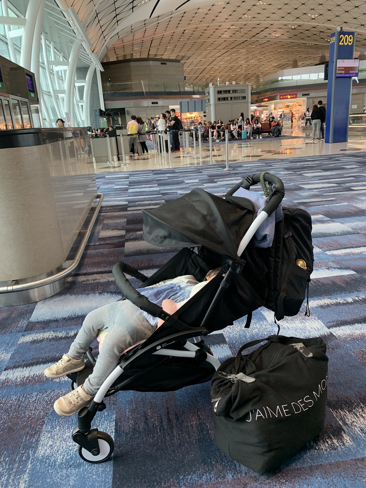 我們都沒有加寄艙行李,所以每人只有1件7kg的手提行李,連同女兒的即我可帶2件手提行李。另外因為我們沒有寄艙行李,所以我問朋友借了可摺疊到很小的嬰兒車,配上袋子便可拿上飛機放座位上面。
