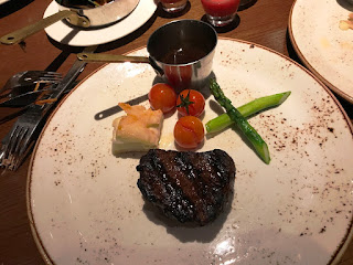 我們分別點了一份「即叫即製的黑安格斯牛扒」及「威士忌醃塔斯曼尼亞有機三文魚扒」。爸爸要了Medium的即叫即製的黑安格斯牛扒, 牛味濃,且非常Juicy,爸爸大讚!至於我點的燒三文魚,味道不過不失吧。