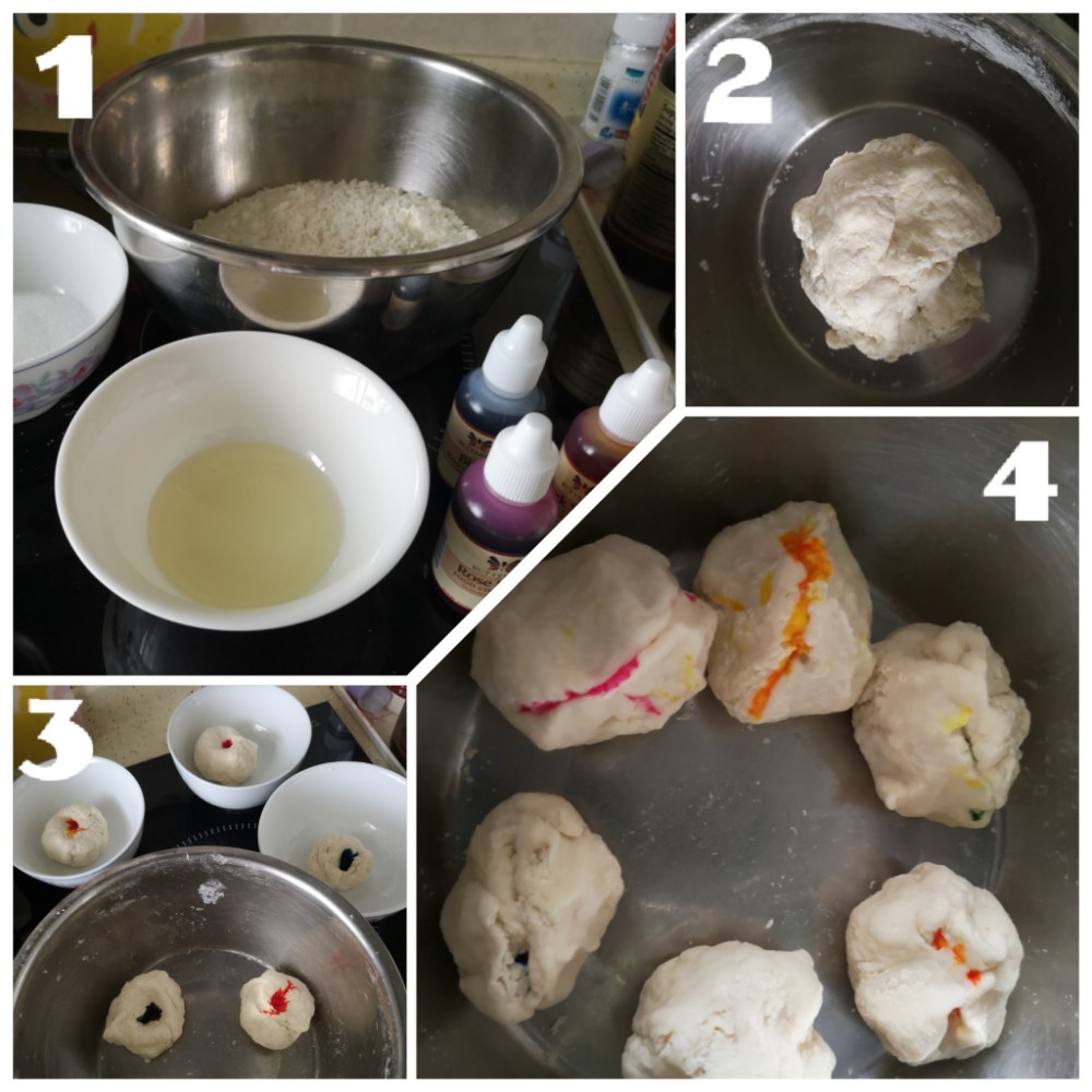 3. 把麵團分開至6份, 搓至圓形, 每一個圓球中間開個小洞再滴入3-4滴食用色素. (紅+藍是紫色, 紅+綠是黃色)