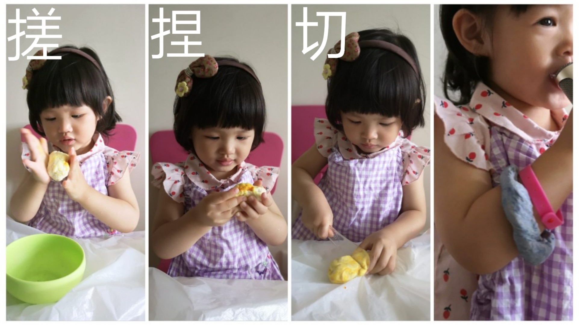 Abigail也有幫手一起搓, 製成品真的跟市面上賣的泥膠很像! 不過我覺得味道更好聞, 因為這是麵粉的氣味, 而不是化學香味! 而且小朋友若果真的不小心吃了也不會有問題啊! 因為成份全都是可食用的. 之前跟Abigail 玩某大牌泥膠時, 我的手就會有點敏感, 覺得癢癢的, 但玩這個DIY泥膠就完全沒有癢呢~