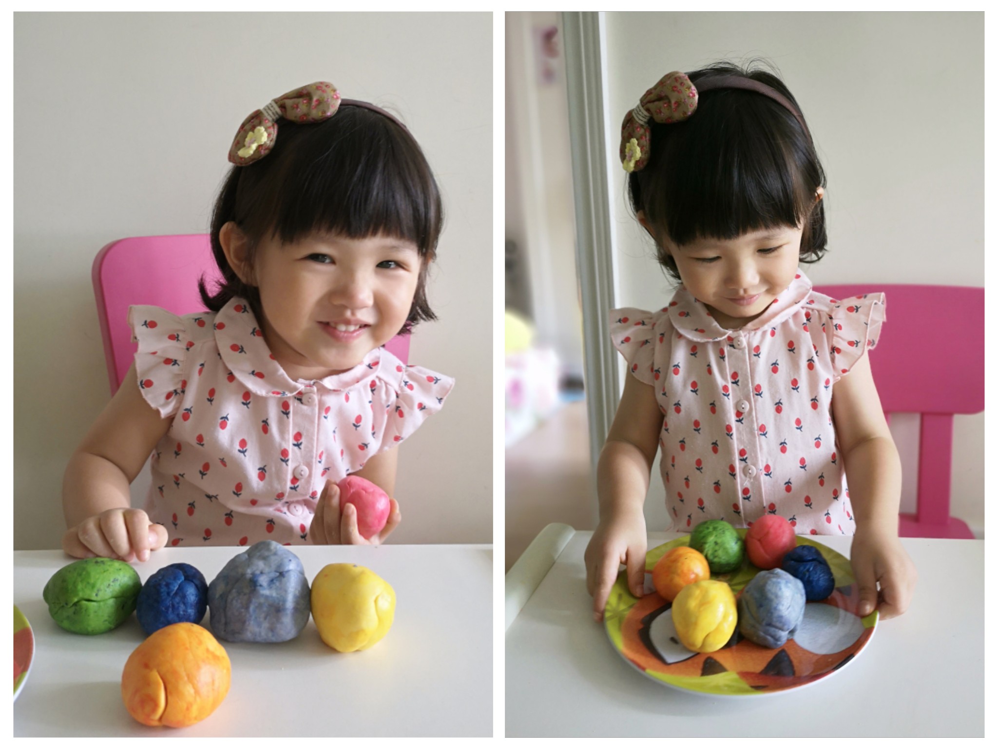 Abigail 看見一個個七彩泥膠球, 很是開心~~我看見也以為是食物了, 用來拍照也不錯看~