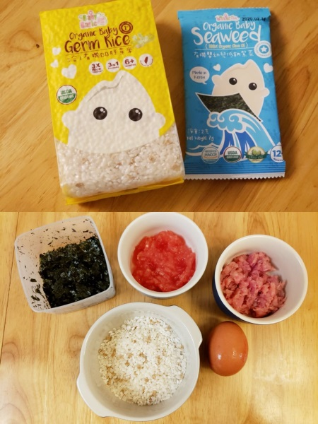 材料:- 百味寶寶胚芽米- 雞蛋1隻- 蕃茄 (切碎)- 豬肉 (切碎)- 百味寶寶有機紫菜 (剪碎)