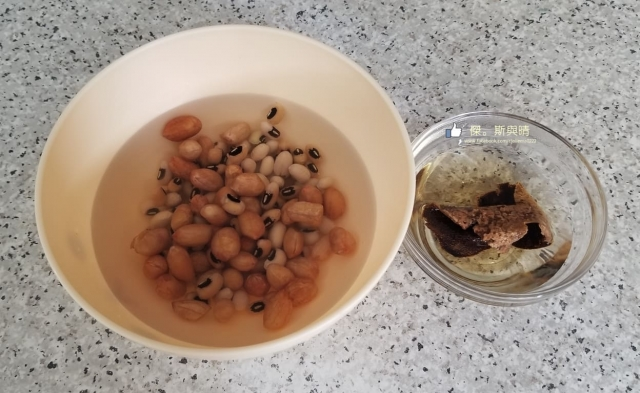 1.) 花生、眉豆及陳皮浸洗,備用。