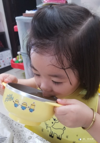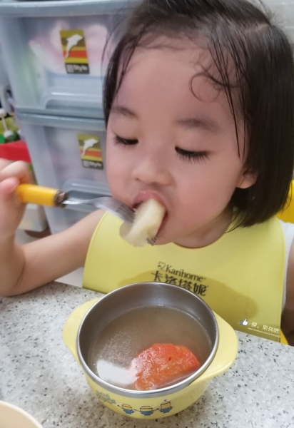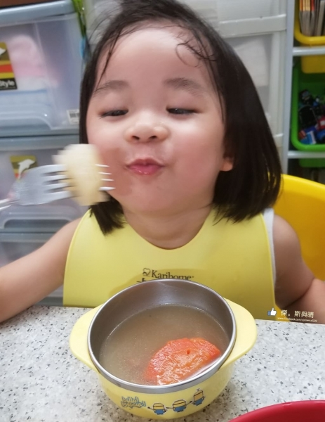 沙葛煲完湯依然爽甜味美,小JM都好鍾意食!你睇佢幾滿足!