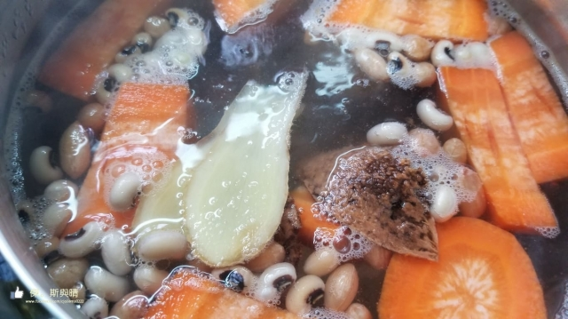 6.) 預先煲滾水,將豬骨、沙葛、紅蘿蔔、花生及眉豆放入