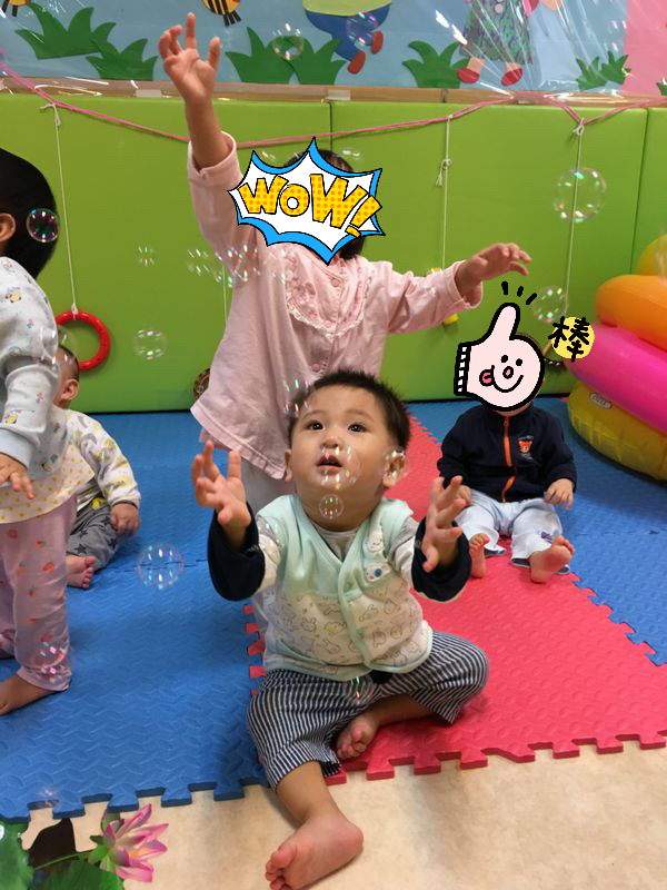 這個階段的小朋友開始認識泡泡這個物體,懂得用眼睛追蹤及用手去捕捉