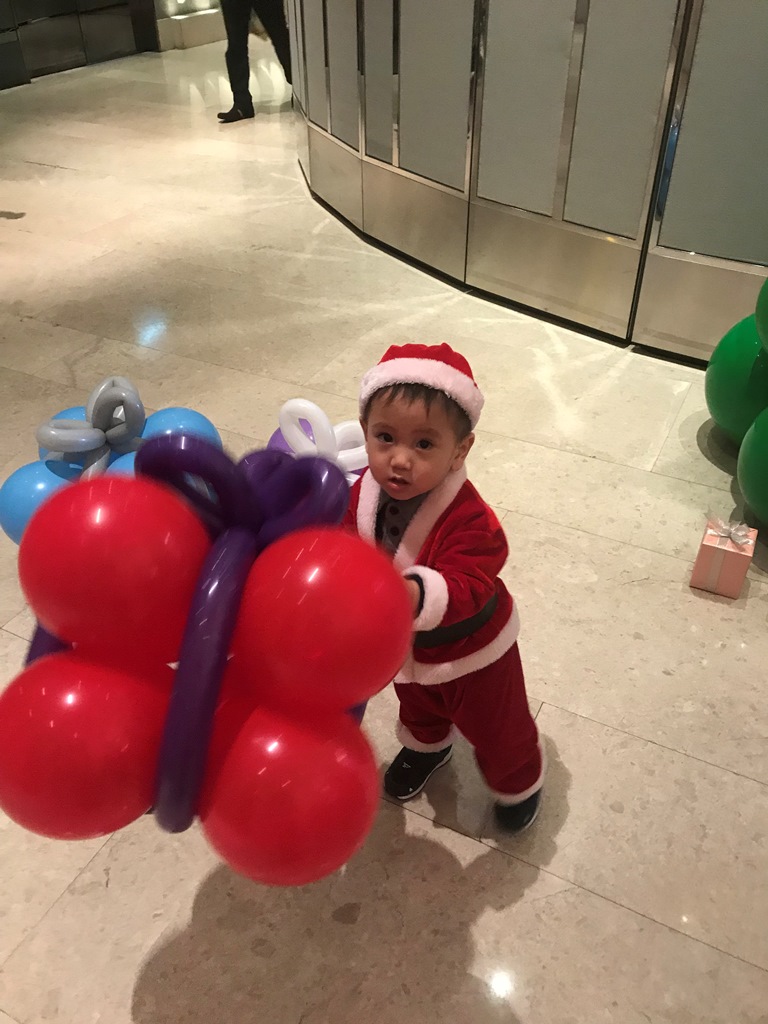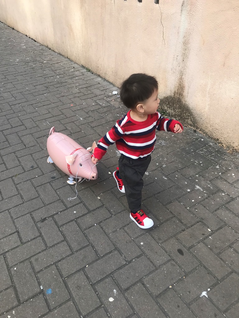 農曆新年時買了一個豬年生肖的氣球,想不到孖吉也可以一邊拖著,一邊走路。