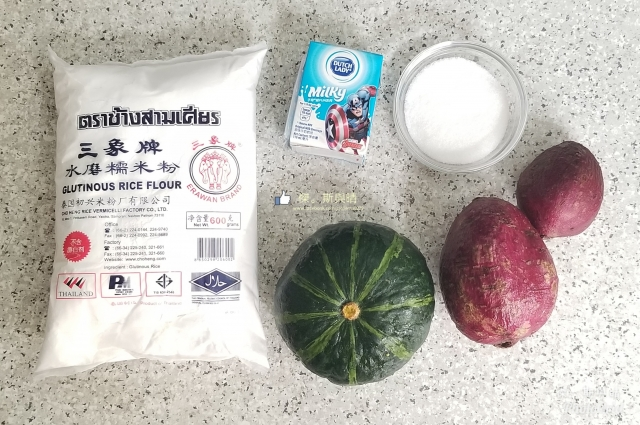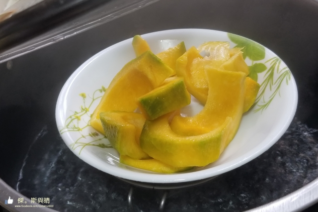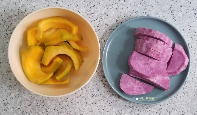 2.) 將已切件嘅南瓜及紫薯蒸熟。