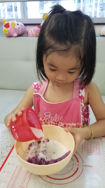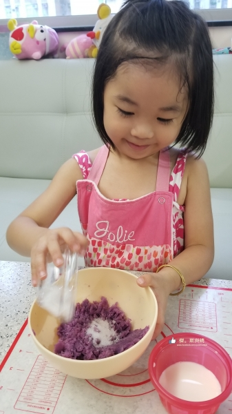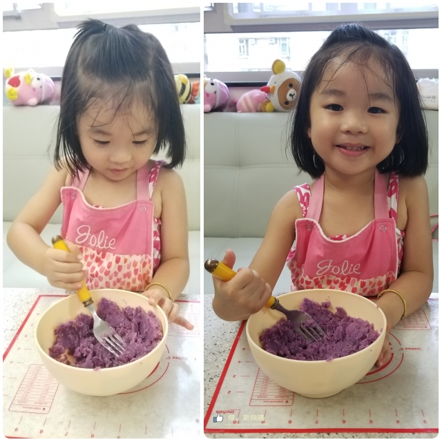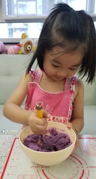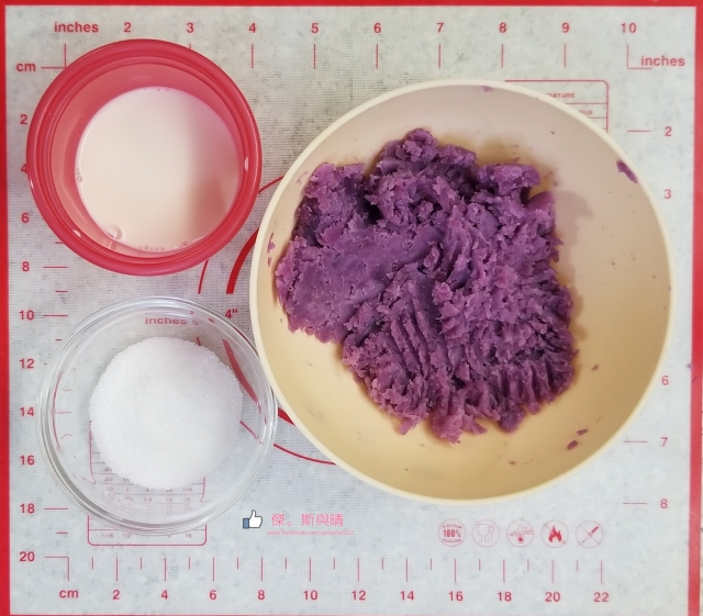 3.) 將蒸熟咗紫薯加入牛奶及糖再壓成蓉。