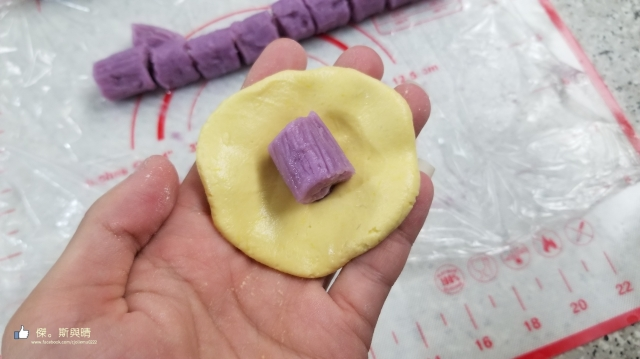 7.) 將南瓜小麵團用手搓圓後再壓扁成圓形,並將紫薯蓉放入,再包好搓圓。