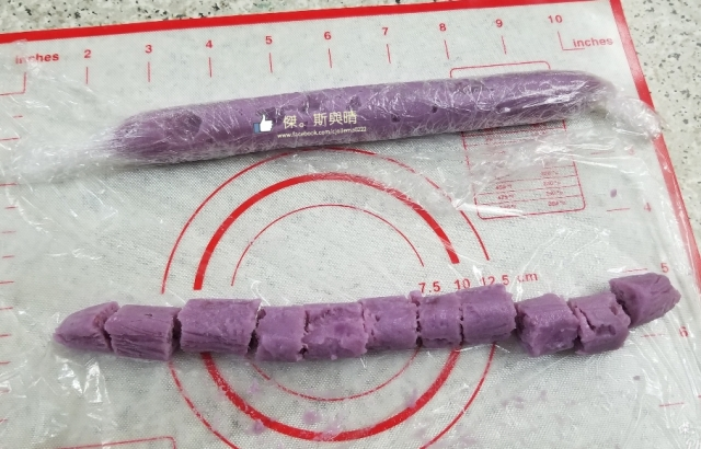 6.) 將紫薯蓉取出,並切成小件,備用。