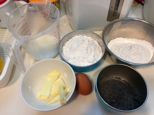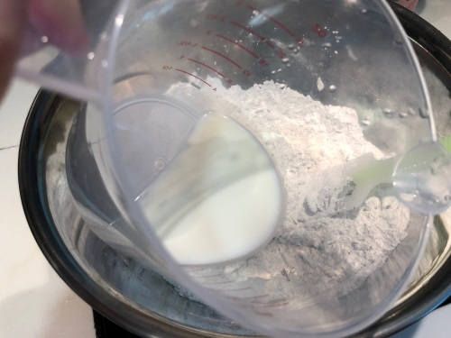 4. 加入牛油溶液、雞蛋,分兩次加入牛奶拌勻