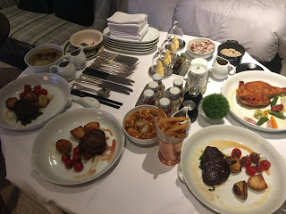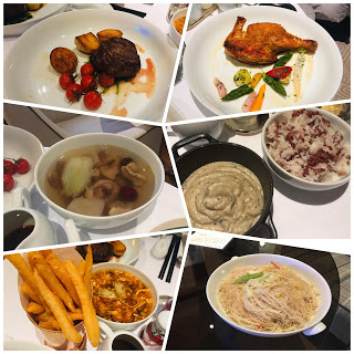 我地叫咗3塊牛扒、燒雞、炒米粉、燉雞湯、龍蝦湯、黑松露薯蓉、糙米飯同薯條