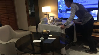 食飽飽已經7點幾,我地又返咗落去房同老爺奶奶、妹妹傾吓今晚食咩。既然三筒唔入得餐廳,我地就叫上來食啦~20分鐘到餐車已經喺我地房出現喇