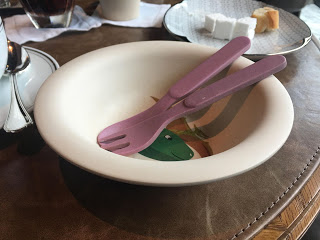 酒店提供嘅兒童餐具有恐龍圖案,米豬又玩咗一輪先食。