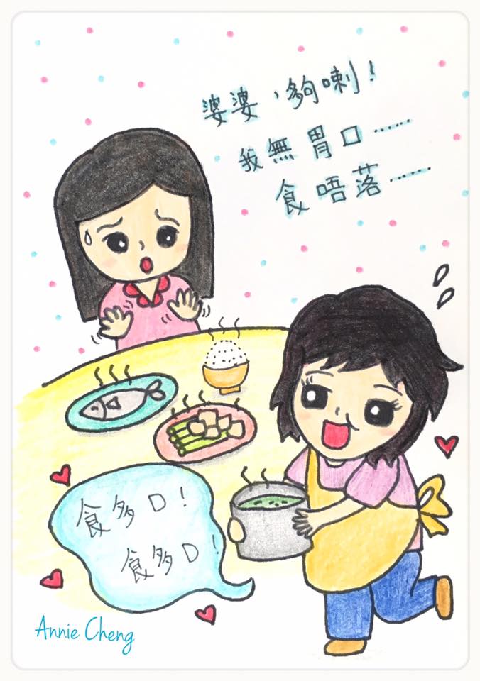 懷孕初期食咩都唔啱胃口,但媽咪和奶奶每日都會煮好多有營養的食物和湯水俾我,希望我可以每樣食小小。更感動的係,媽咪竟然為左個孫去讀陪月課程,溫書做功課,外婆真係好偉大!