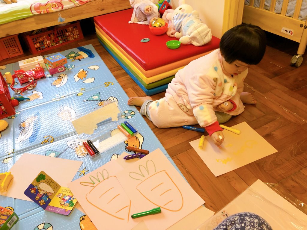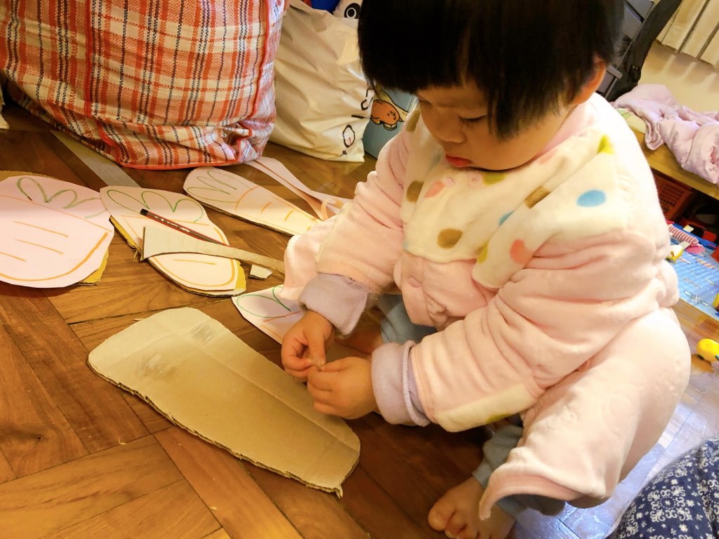因為武漢肺炎關係要減少出街,所以以上材料都係喺屋企搵。預備過程好簡單,首先同Elly親子畫畫,然後由我剪出籮蔔,跟著再親子貼貼,完成!