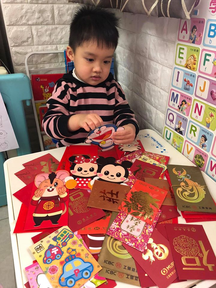 Aidan第一年自己拆利是,佢竟然覺得好好玩。