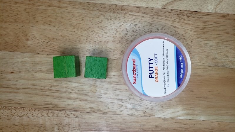 玩法:兩隻手的尾指及無明指夾實積木,然後用力用前三指將練力膠拉開,而積木是不可掉下來的