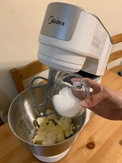 2.將已室溫忌廉芝士放入大盆中,用打蛋器攪拌,攪拌至微軟的狀態。