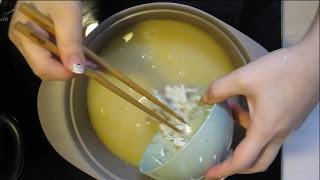 7/ 這個雞湯全是我自己熬的,沒有添加鹽及味精。如果媽媽沒有時間熬同時不希望小朋友飲用味精雞湯,可以全以清水代替,因為利用魚及蝦熬湯已經十分鮮甜