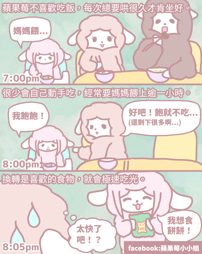 蘋果莓在剛加固至一歲的時候,吃飯會很快就吃光光,也會自己搶著匙羹吃,從不用家人操心。可是自兩歲起,不知怎的,蘋果莓吃飯變得慢吞吞,一坐在bb椅上就嚷著要媽媽餵,不餵她就把雙手藏到背後,怎樣都不肯自己拿餐具吃。